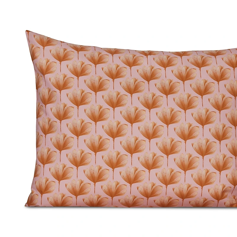 Printed on Italian-woven long-staple cotton, in two striking colorways, Edna is an ode to vivid extravagance. The reversible design offers two distinct expressions of artistry. On one side, a repeat Ginkgo leaf pattern, symbolizing beauty and enduring quality with its graceful form. On the other, a minimalist art deco texture unfolds, kaleidoscopic in its mesmerizing symmetry.