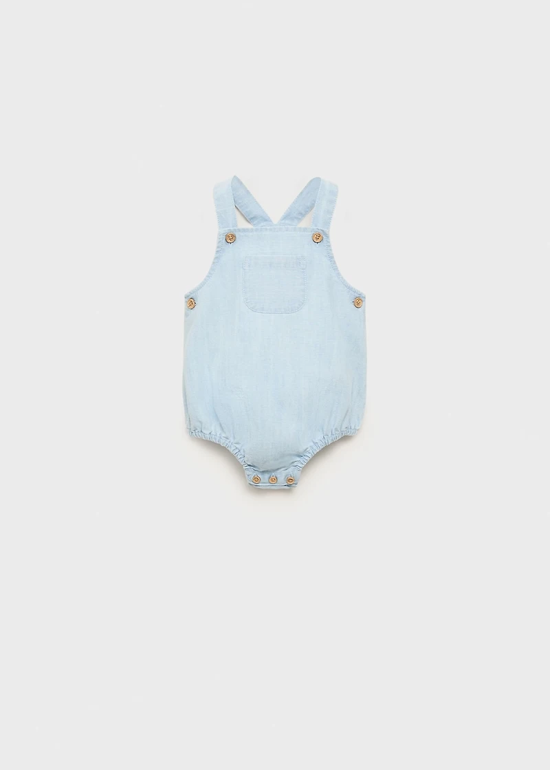 100% cotton fabric. Denim design. Straight design. Short design. Straight neckline. Straps with button closure. Side button closure. Bottom opening with button closure.