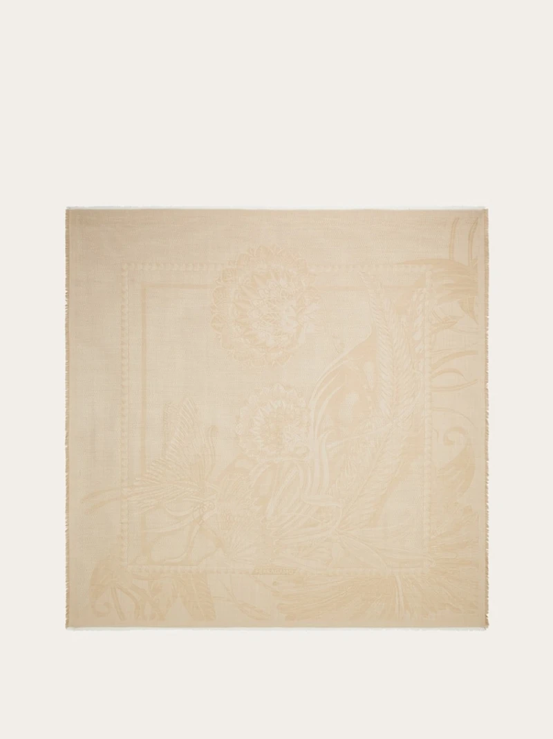 Luminous, featherlight silk and warm, cozy cashmere come together to create this chic new stole. The large dimensions are the perfect backdrop for the jacquard workmanship used to create the Giada pattern, a motif made up of butterflies and dancing flowers set on a geometric frame.