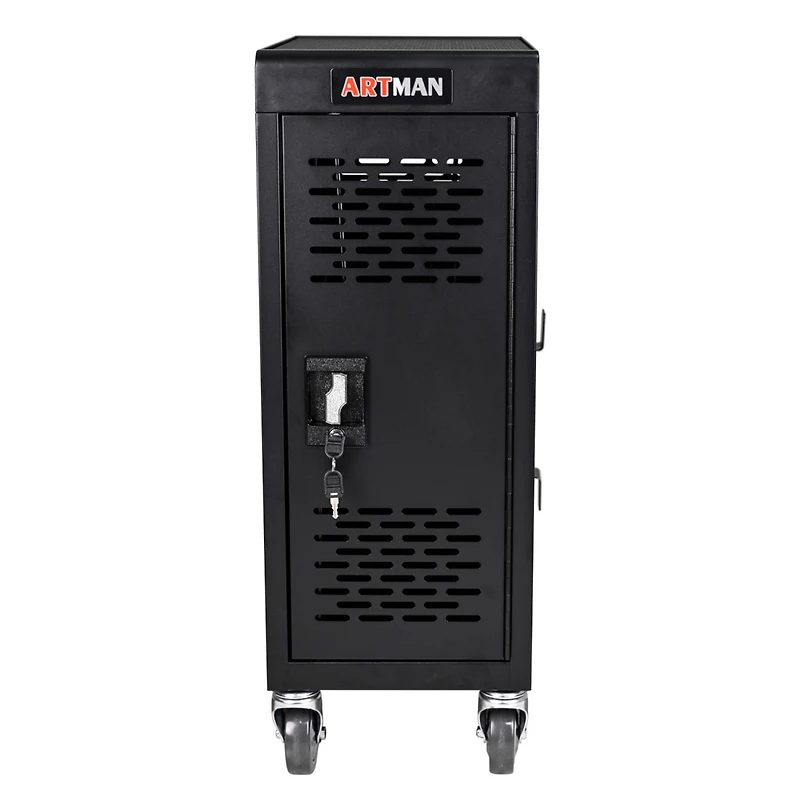 16-Compartment locking charging cabinet for laptops, made of cold rolled steel with powder coating. Features universal casters, Ul-certified power strips, and a handle for easy movement. Dimensions 560360780mm, black color, and 24.45KG net weight.