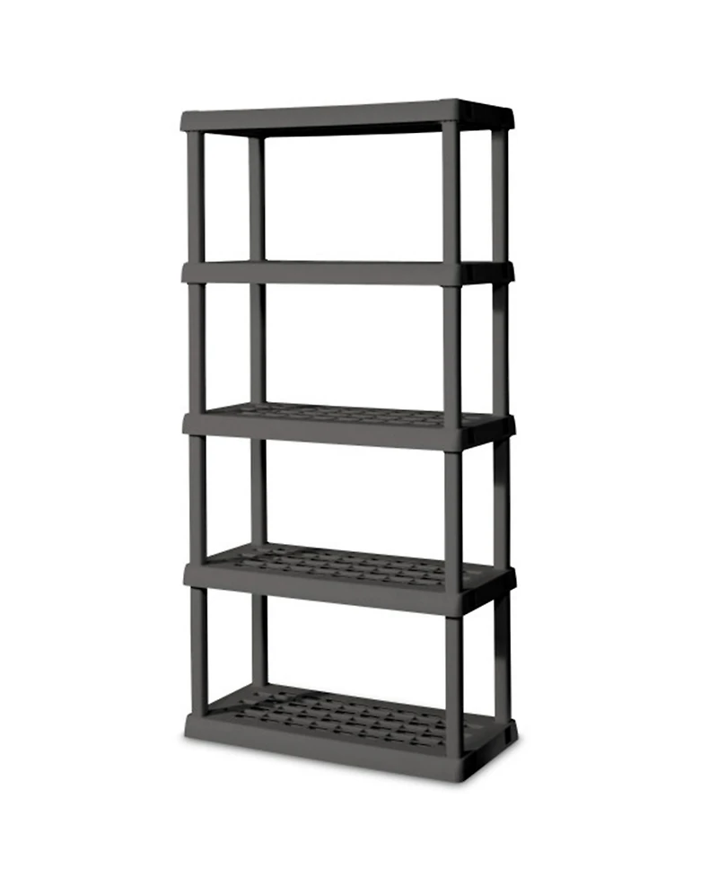 Organize with ease! The durability, modularity, and simplicity of the Sterilite 5-Shelf Shelving Units make it the ideal solution for basements, attics, and garages. The trend-forward flat gray color is both sleek and refined and complements a variety of living areas, offering additional storage options for pantries, utility or laundry areas, dorms, and mudrooms. Rugged tubular construction is designed for heavy-duty usage, with ventilated shelves. Heavy-duty plastic materials are sure not to dent, chip, or peel, ideal in challenging environments. Each shelf has a recommended weight limit of 150 pounds. Shelving assembles easily in minutes without the use of tools, simplifying your organizational project. Create a custom storage solution with other Sterilite Hardware items, such as the 4-Shelf Cabinet, 4-Shelf Shelving Unit, and 4-Drawer Unit.
