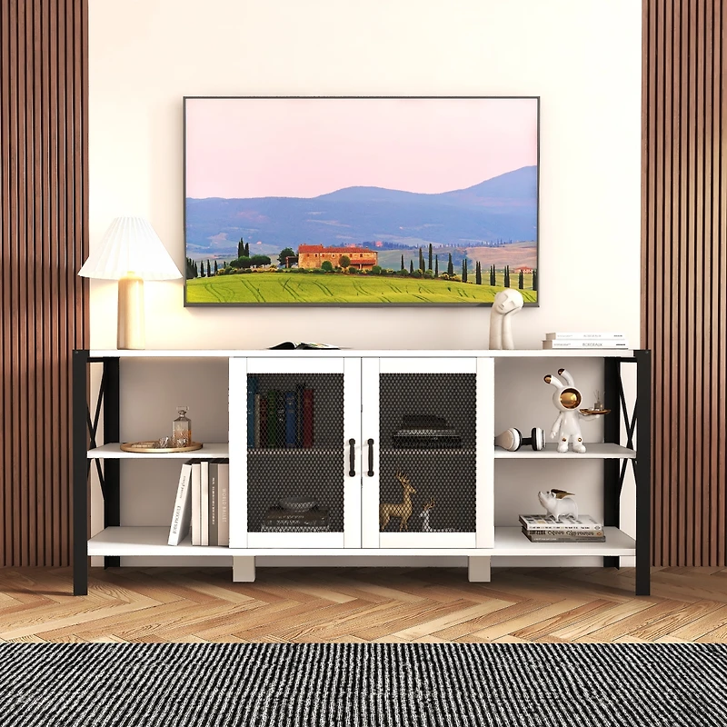 This industrial Tv stand combines modern style with vintage elegance. Made from high-quality materials, it provides ample storage space with open shelves and a mesh door. Durable and sturdy, it can withstand heavy TVs and equipment, making it a versatile choice for any room.
