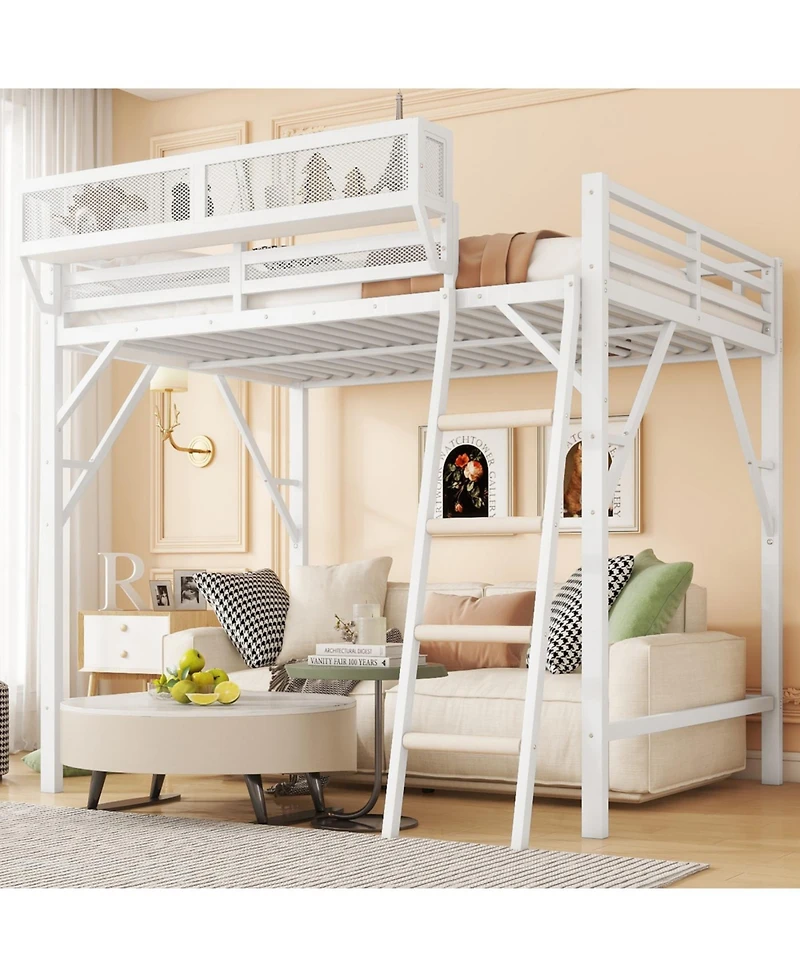 Maximize your space with this Queen Loft Bed! Features integrated storage shelves, a secure ladder with non-slip steps, and 54.3" of under-bed clearance for desks or seating. Durable metal construction supports up to 400 lbs. Perfect for kids!