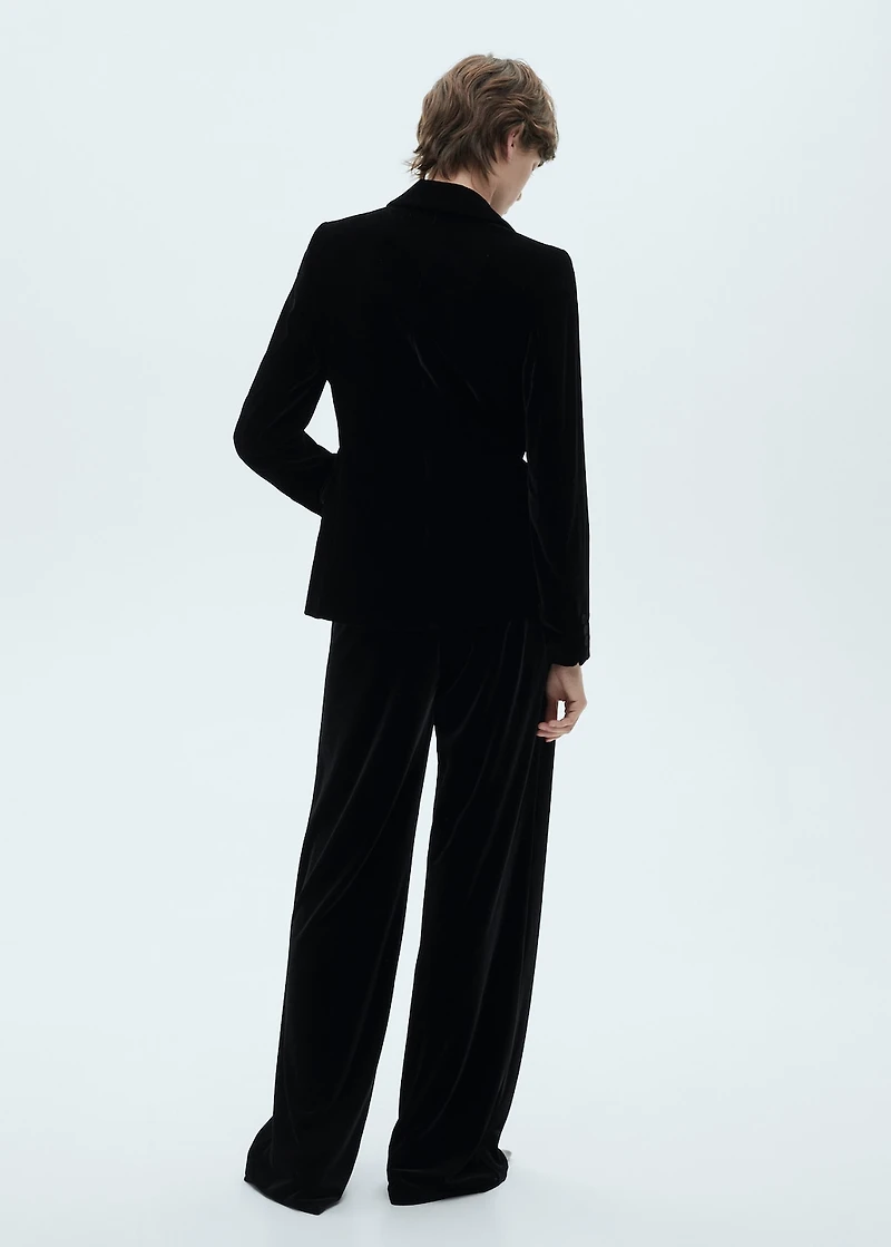 Velvet fabric. Straight design. Long design. Lapel-collar V-neck collar. Notch lapels. Long sleeves. Two front welt and flap pockets. Chest welt pocket. Front button closure. Inner lining. The fuchsia color is an online exclusive. Available in Plus sizes. Party and ceremony collection.