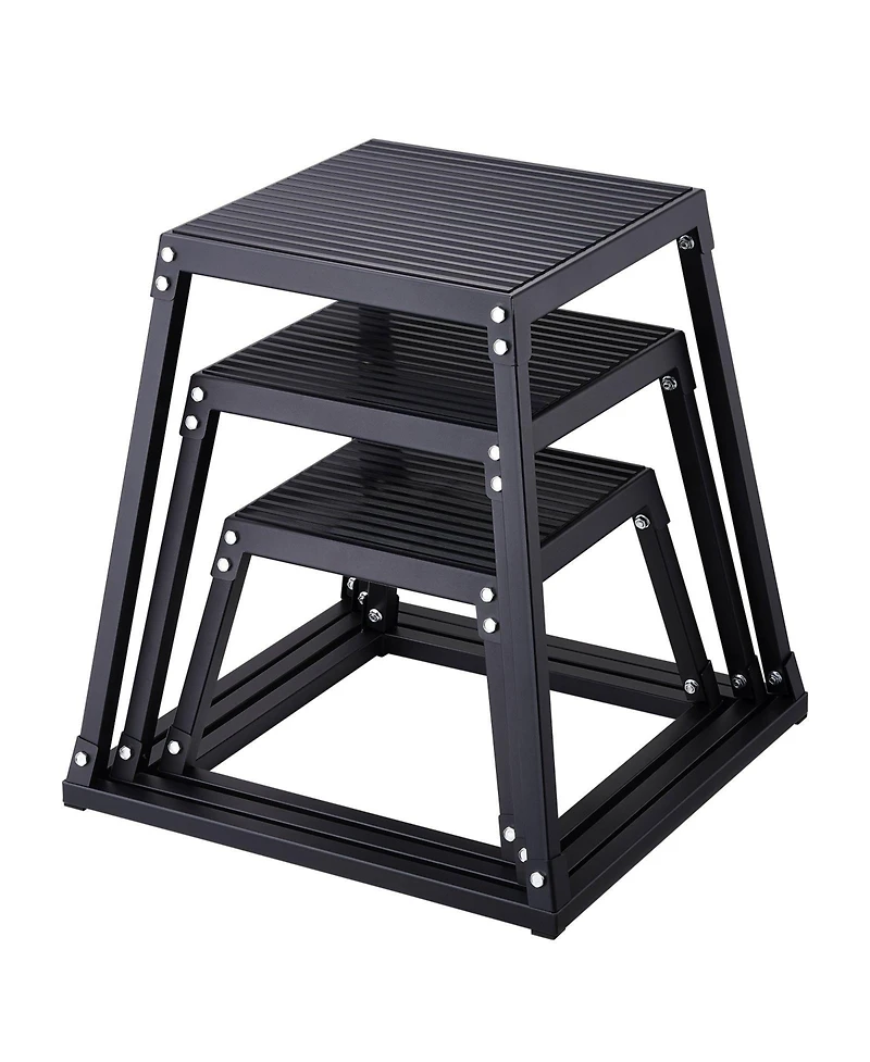 Boost your training routine with this 3-piece steel plyometric jump box set, featuring 12", 18", and 24" heights for full-body workouts at any fitness level. The trapezoidal design and powder-coated steel frame deliver strength and durability, supporting up to 500 lbs. Non-slip rubber feet and textured silicone top ensure safe jumping and landing. Whether you're doing squats, push-ups, or step-ups, this multi-size plyo box set helps enhance strength, agility, and balance. Easy to assemble and stack for space-saving storage.