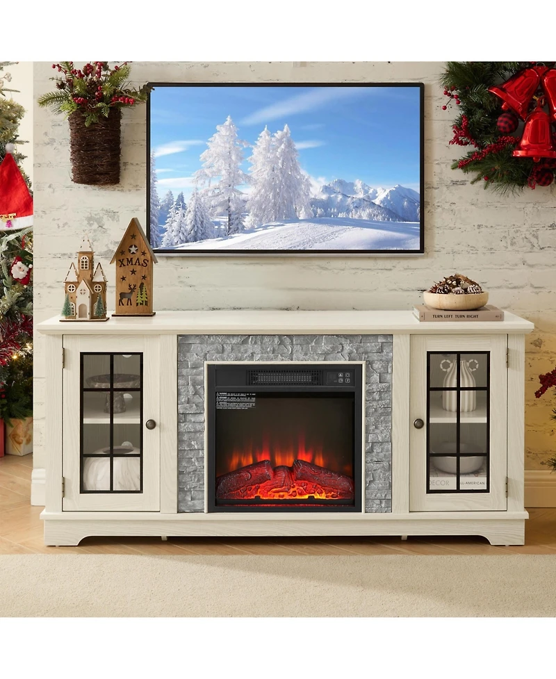 This modern cabinet measures 58.31"W x 15.39"D x 26.06"H and supports TVs up to 65". Made from durable Mdf and Pb, it includes 6 cable cutouts and 4 adjustable shelves for tidy storage. The built-in electric fireplace provides 1,400W (4,777 Btu) of adjustable warmth, with temperature settings from 62°F to 82°F, a timer from 30 minutes to 6 hours, and 3 flame brightness levels. The faux stacked stone and wood veneer surround highlights the realistic flame effect, while the smooth surface cleans easily. Finished with vintage metal handles, it combines ample storage, cozy heating, and timeless style in one versatile piece.