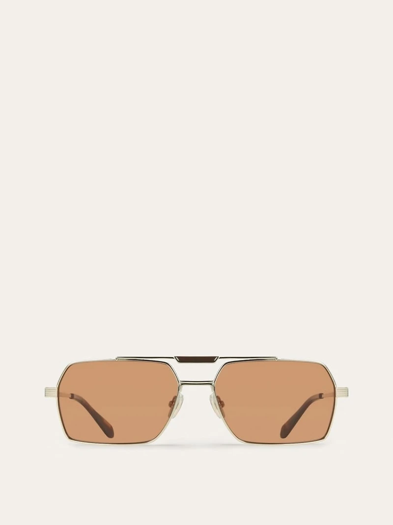 The Ferragamo logo is lasered onto the top bar of the double bridge and on the temple plates incorporating the hinges.