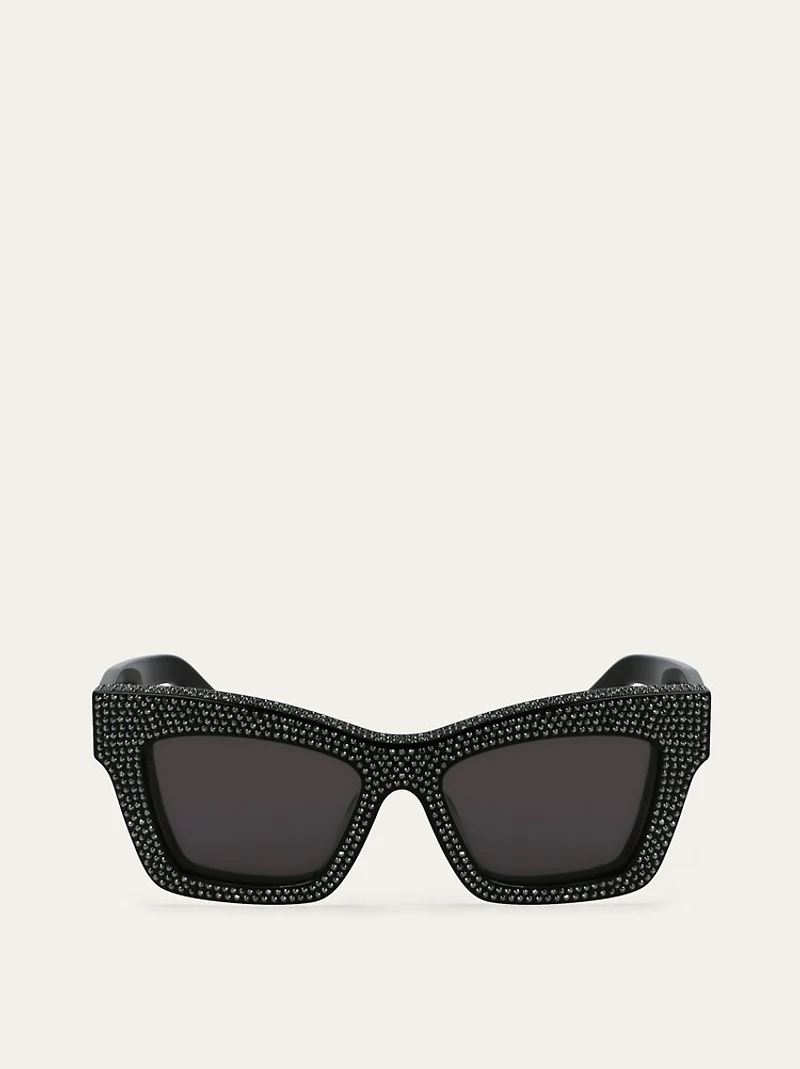 Sunglasses featuring a distinctive design that reflects the Maison’s artisanal excellence and spirit of innovation. The model combines heritage and modernity in a rectangular acetate silhouette, defined by bold profiles, accentuated angles and a refined decoration created with 793 Swarovski “chaton” crystals meticulously applied by hand on the entire front and shaped with a special “Xilion” cut that enhances their sparkle.