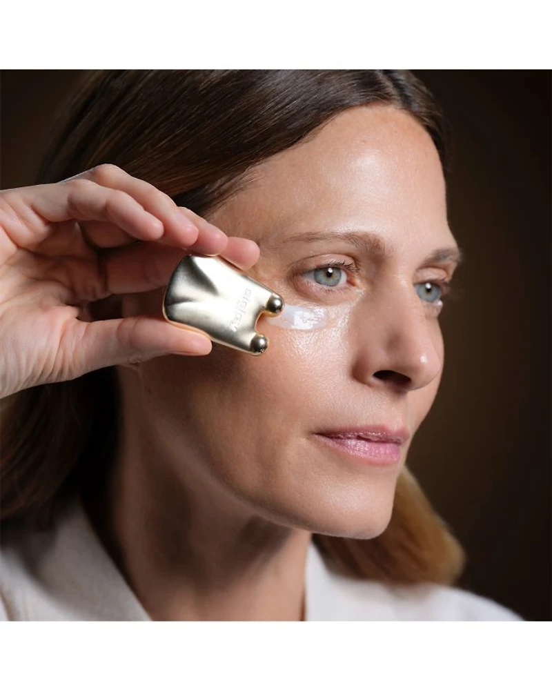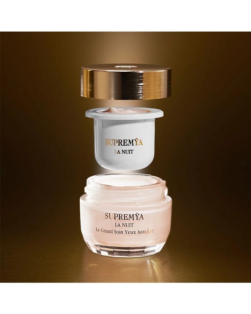 WHAT IT IS: All the power of Supremÿa at Night for the eye contour. The Supreme Eye Cream offers a mesh of targeted anti-aging solutions, helping with the specific concerns of the eye contour overnight. Wrinkles and fine lines look smoothed. Dark circles and puffiness appear reduced. Eyelids seem lifted SKIN TYPE: For all skin types. SKIN CONCERN: Anti-dark circles, anti-puffiness, anti-wrinkle. WHAT IT DOES: - The Supreme Eye Cream offers complete effectiveness on the eye contour, the first area of the face characterized by a low regeneration potential. In the morning, the eye contour looks more luminous. The eyes appear wider-looking. Night after night, eye contours appear revitalized and lifted. - At the heart of this skin care is the Fundamental Regeneration Complex, a unique combination of powerful key ingredients that precisely stimulate the three key stages of the night cycle, when the skin's regenerative power is at its highest. - Fine and light, its ultra-modern texture melts pleasantly over the eye contour, leaving a sensation of freshness and intense comfort, for a unique sensorial experience. - For optimized results, this skin care comes with its exclusive zamac massage accessory. A tailor-made four-step gesture to revitalize, smooth, lift and stimulate the eye contour. - The Supreme Eye Cream is suitable for sensitive eyes and contact lens wearers. Tolerance tested under dermatological and ophthalmological control. - The multi-faceted glass jar has been specifically designed to accommodate a refill (sold separately). KEY INGREDIENTS: - Fundamental Regeneration Complex is a powerful combination of active ingredients. - Yellow gentian extract reduces the look of puffiness and acts on the appearance of multiple types of dark circles and targets puffiness. - Codium extract targets pigmentary dark circles linked to the accumulation of colored compounds and vascular dark circles. - Caffeine tones and helps reduce puffiness. - Adenosine has anti-wrinkle effects. - Oat seed extract provides an immediate tightening and smoothing effect. - Soy fiber extract improves the appearance of firmness. - Shea butter nourishes, soothes, softens and protects. - Plum kernel oil brings comfort and suppleness to the skin. - Glycerin moisturizes. - Alpha-bisabolol soothes and softens.