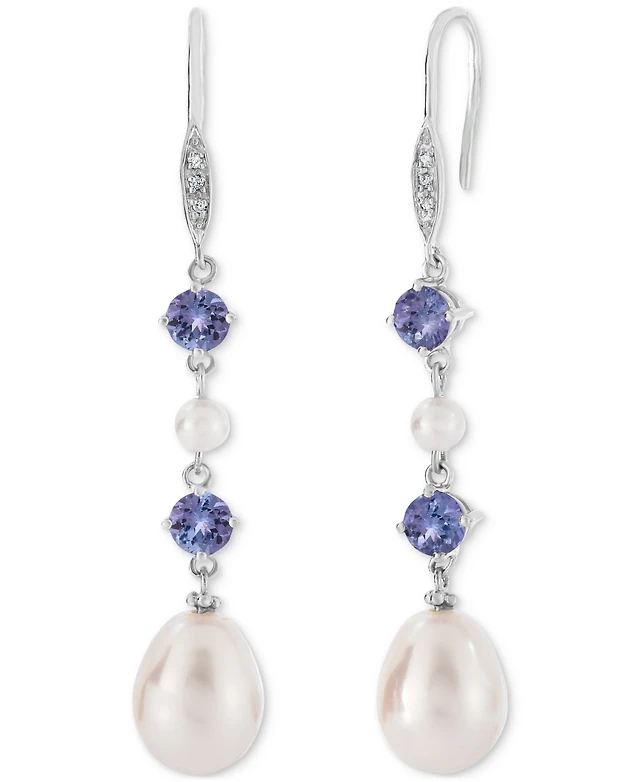 Tanzanite (1 ct. t.w.), Cultured Freshwater Pearl (3mm, 10x7mm) & Diamond Accent Linear Drop Earrings in Sterling Silver