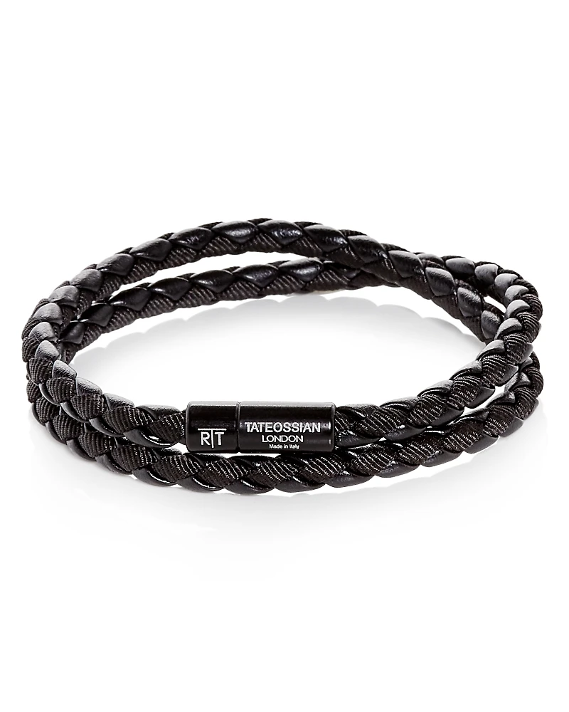 Tateossian Double Wrap Woven Bracelet.Color:Black.Size:Large.Material:Leather/fabric/rhodium/sterling silver.Bracelets.