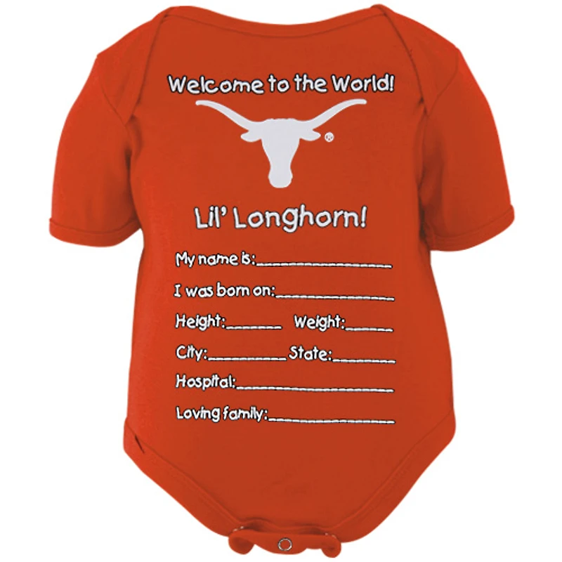 Introduce your precious newborn to the lavish lifestyle of being an esteemed UT fanatic with this teeny-tiny Welcome to the World creeper! It states, "Welcome to the World!" over a bold team logo and "Lil' Longhorn!" lettering. Below that it lists blank spaces to write their name, birth date, height, weight, location and family name. This adorable creeper will get your itty bitty baby singing the 'Horns fight song before you know it!
