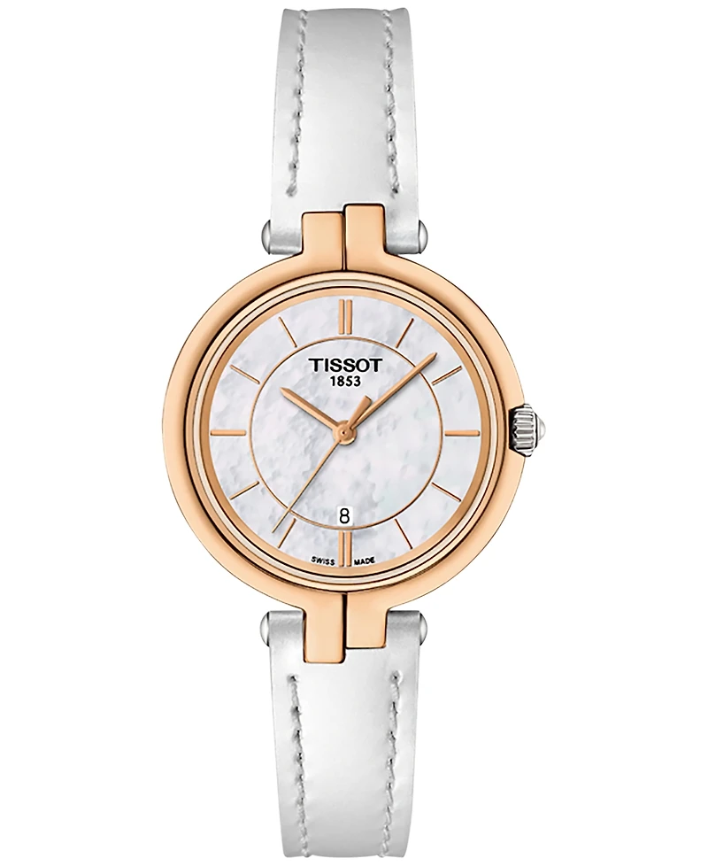 A sophisticated rose gold-tone case highlights the stunning white of this leather Flamingo watch by Tissot.