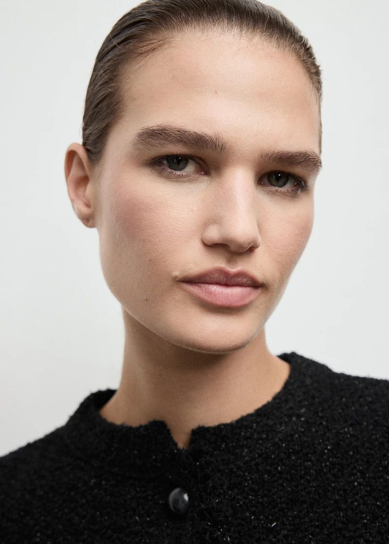 Crafted from tweed fabric with lurex, this fitted design features a round neckline and long sleeves. It has two front patch pockets and frayed edges. Front closure with buttons