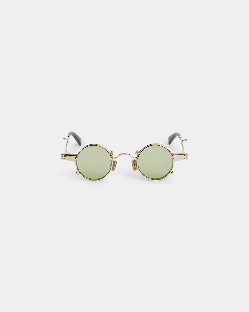 Pair of sunglasses with colored lenses featuring a double-lens system. Including a pivoting lens attached to the side that opens or closes with a side rotation.