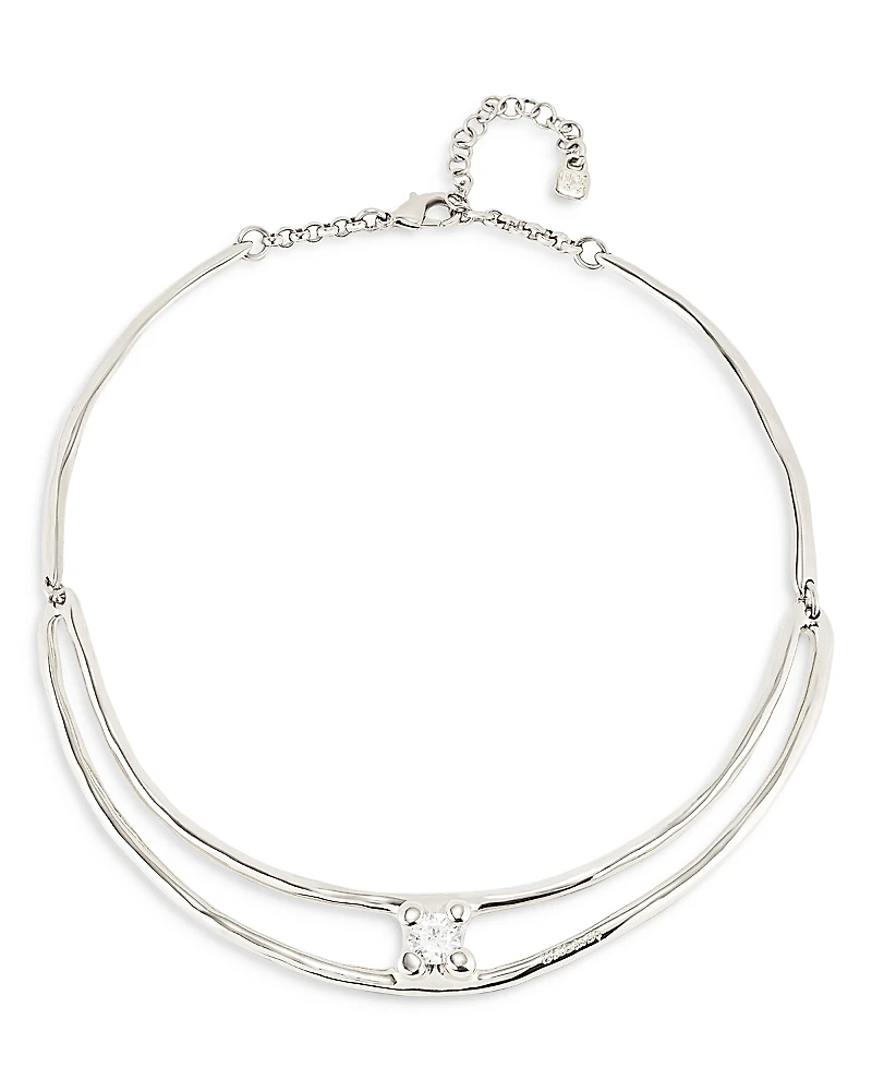 Two parallel rigid bands sweep around the neck, converging at a row of brilliant white zirconia that lends sculptural sparkle to the cool plating.