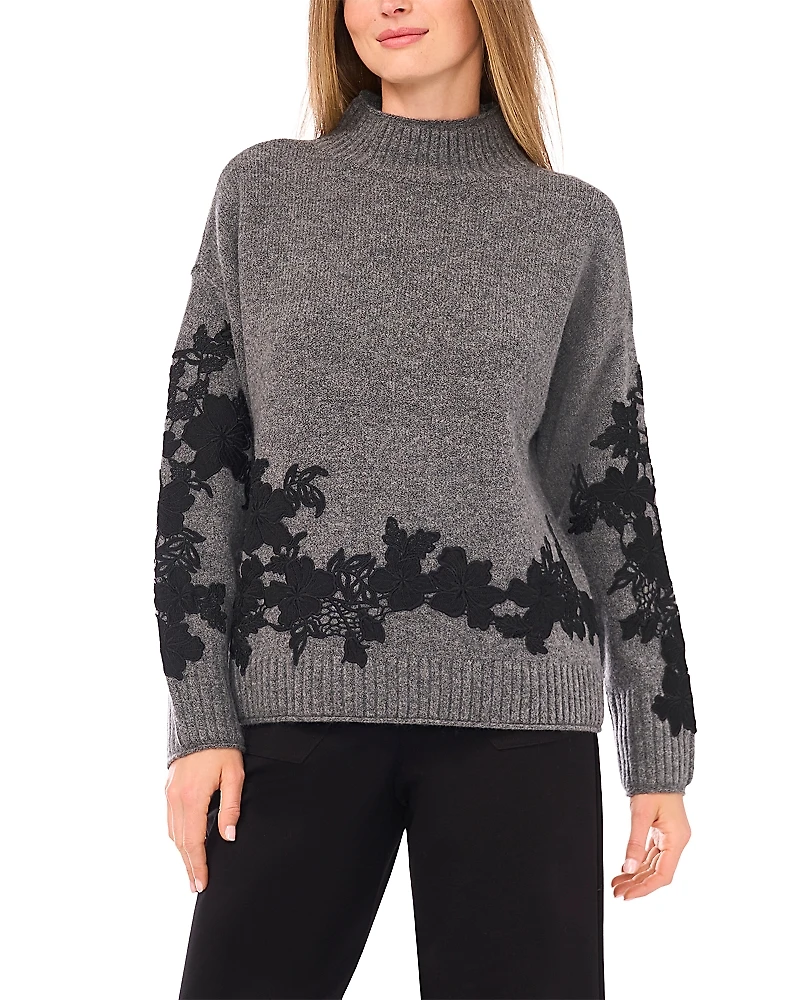 Vince Camuto Floral Applique Sweater.Color:Salt And Pepper.Size:L.Material:73% acrylic/24% polyester/3% spandex.Sweaters.