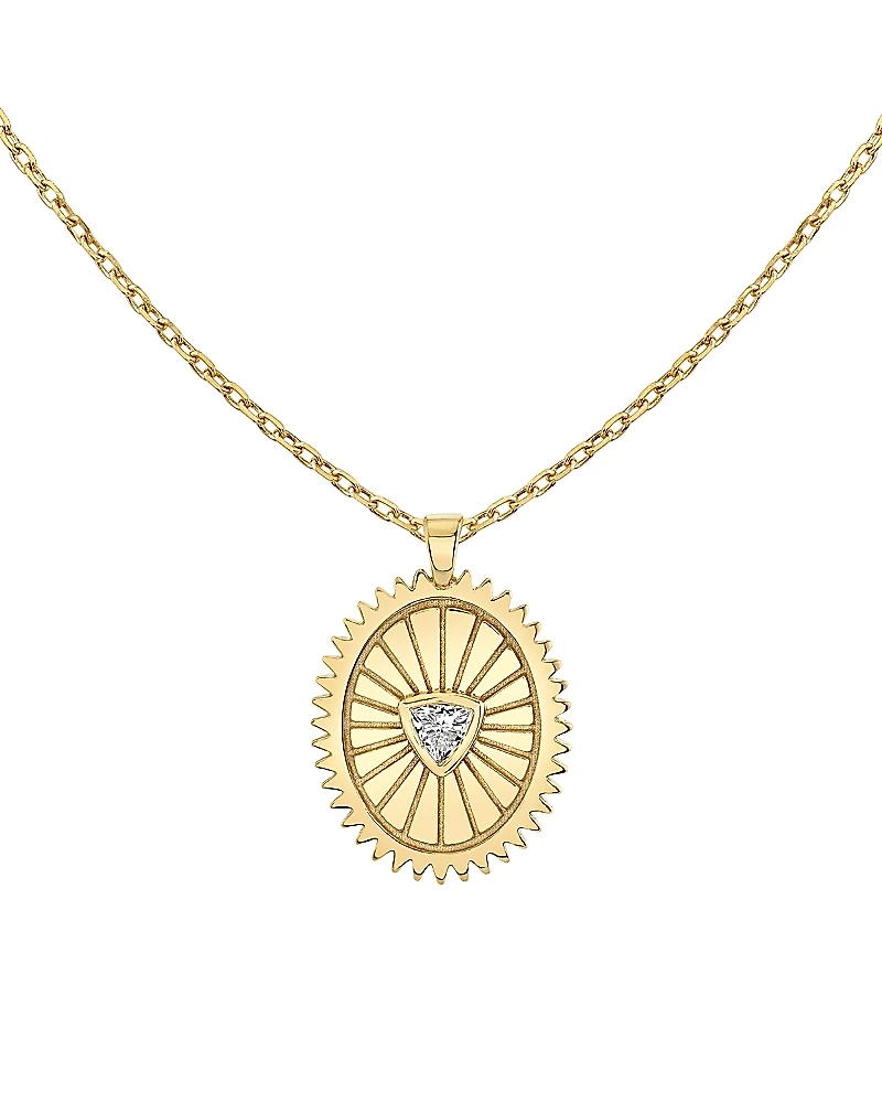 Awaken your passion and capacity for greatness with our Inner Fire Medallion Necklace, where 14K gold rays emanate from a sustainably created trillion diamond. A thoughtful bezel setting and an open back gallery draw in light from all angles, allowing your diamond to shine as a beacon of resilience.From diamond creation to final setting, your made-to-order design is intentionally crafted to be uniquely yours.Metal: 14k Yellow GoldVRAI created diamondOrigin: Sustainably grown with zero emissionsShape: TrillionColor: Colorless (Def)Clarity: VS2+Cut: Excellent+