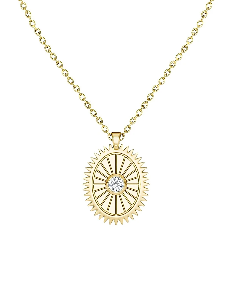 Find enduring beauty and wisdom with our Inner Light Medallion necklace, where 14k gold or sterling silver rays emanate from a Round Brilliant Vrai created diamond. A refined bezel setting and an open back gallery draw in light from all angles, allowing your diamond to shine as a beacon of confidence and truth. From diamond creation to final setting, your made-to-order design is intentionally crafted to be uniquely yours. Metal: 14K Yellow GoldSetting: Knife-Edge BezelVRAI created diamondOrigin: Sustainably grown with zero emissionsShape: Round brilliantColor: Colorless (Def)Clarity: VS2+Cut: Excellent+Carat weight: 1/10ct