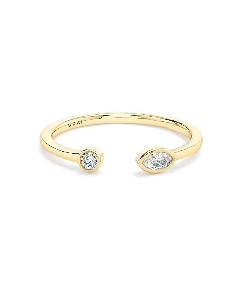 Round Brilliant and Marquise shaped Vrai created diamonds form delicate petals on either end of a 14k solid yellow gold open cuff design perfect for stacking or wearing solo. From diamond creation to final setting, your made-to-order design is intentionally crafted to be uniquely yours. Metal: 14k Yellow GoldSetting: BezelVRAI created diamond1x 0.10ct Marquise1x 0.05ct Round BrilliantAll diamonds are sustainably created by Vrai.Count: 2Origin: Sustainably grown with zero emissionsShape: Round Brilliant, MarquiseColor: Colorless (Def)Clarity: VS2+Cut: Excellent+