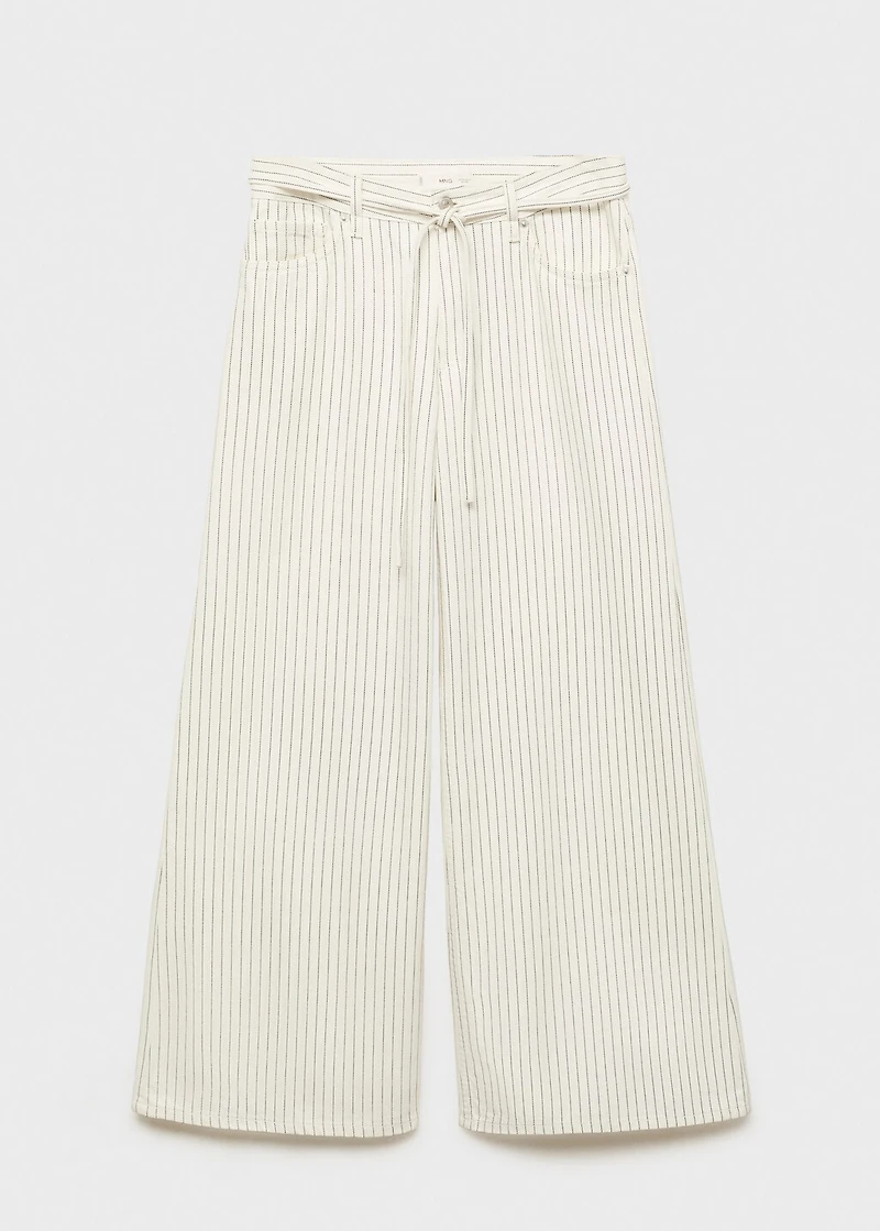 Cotton denim fabric. Long design. Wide-leg design. Striped print. Low waist. Belt loops. Five pockets. Removable belt. Front zipper and button closure.