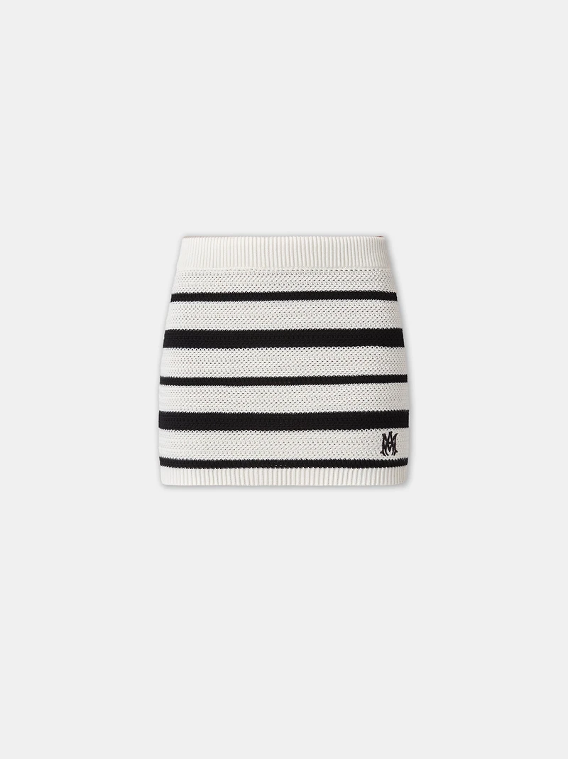 The season's knit stripe appears in a slim-fit skirt for Pre-Spring 2025. The MA Striped Mini Skirt is designed in knit Egyptian cotton and finished with the embroidered MA icon and fine rib accents.