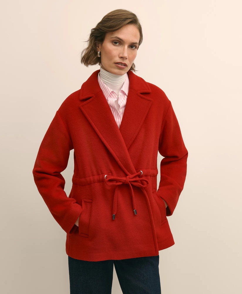 Crafted from a refined double-faced wool blend, our coat features an open front with a drawcord waist for casually polished versatility. It's your new go-to that brings a pop of color for all your fall days.