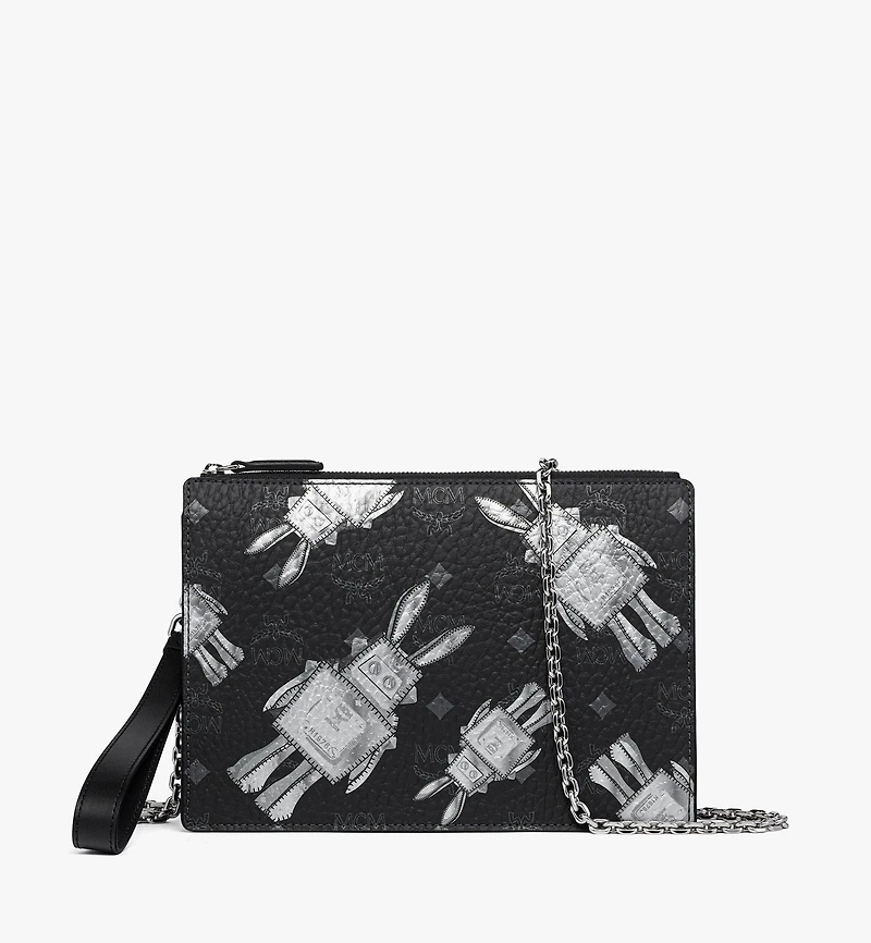 Rabot — the House’s advanced cybernetic hare — represents the merger of nature and technology in an intergalactic future. Presented atop the elegant expanse of the signature Visetos monogram, the monochromatic artwork elevates the visual splendor of the Munich House’s classic standing pouch — featuring two modes of carriage in the form of a detachable chain strap and soft leather wrist handle strap.