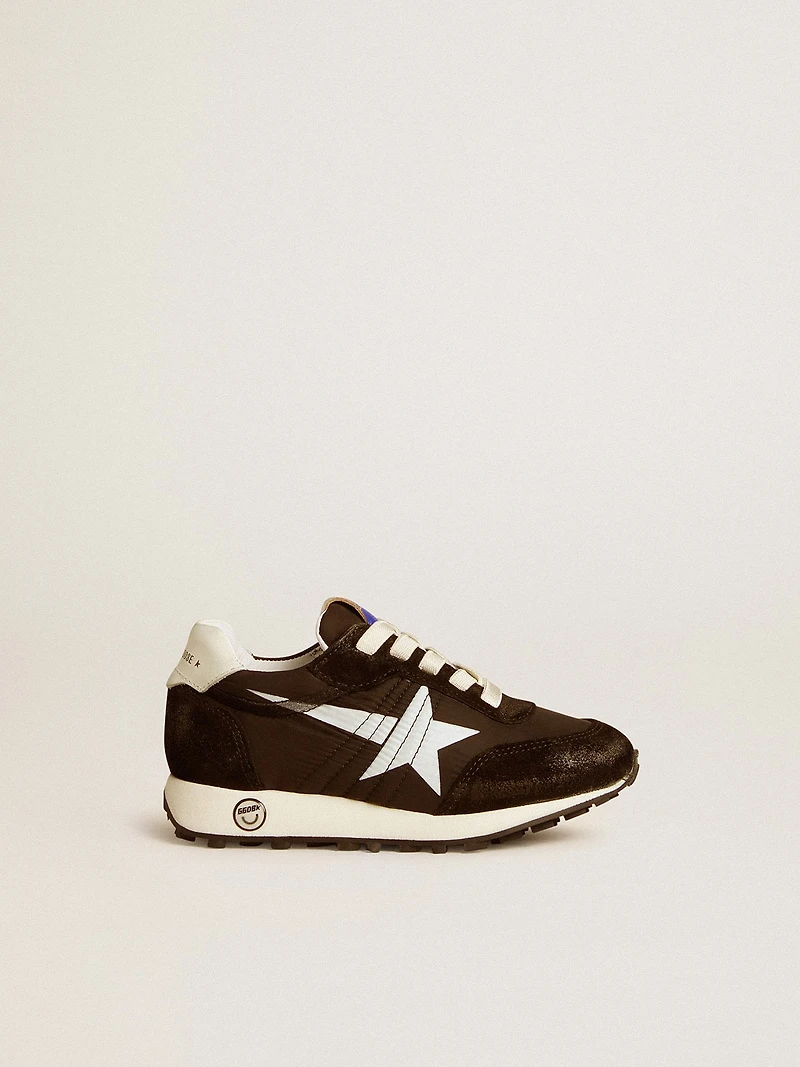 Track and field-inspired, with a Seventies flair. Day after day, our new Marathon sneakers are designed to keep you running after your dreams, paying homage to the marathon that is life. In black nylon accentuated with black suede inserts, the Young version of this model features a white printed star and white leather heel tab. The look is completed by a contrasting smiley on the foxing, white laces and a starred outsole that make a truly unique impression.