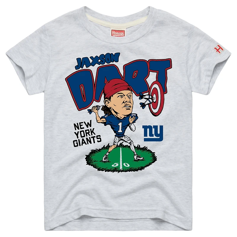 Let your kiddo show their support for the New York Giants star Jaxson Dart with this Caricature Tri-Blend T-Shirt from Homage. It's a perfect way to introduce the younger generation to the gridiron and the excitement of NFL football. Featuring a fun, caricature design of Jaxson Dart, this tee brings a playful energy to game day or everyday wear. The relaxed fit and lightweight feel ensure all-day comfort, making it ideal for active kids.