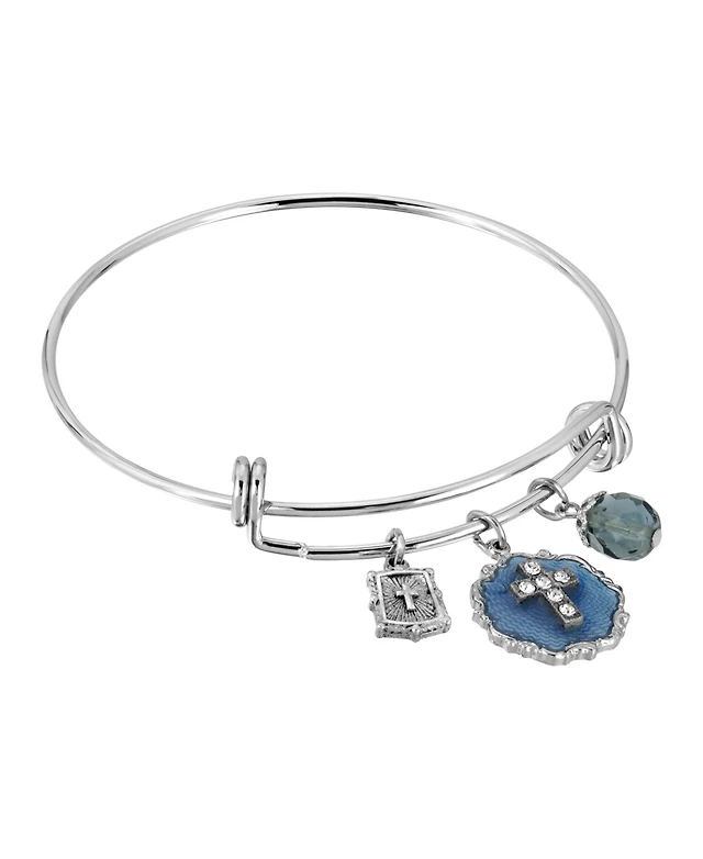 Silver-Tone Blue Enamel Crystal Cross Beaded Slide Charm Bracelet